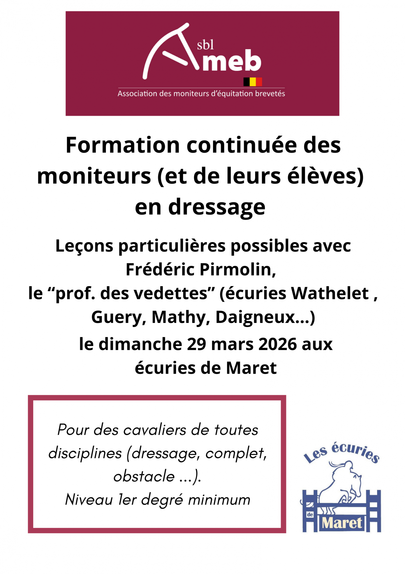 L'AMEB (Association des Moniteurs d'Equitation Brevetés) organise une nouvelle formation pour les moniteurs Adeps (et leurs élèves).