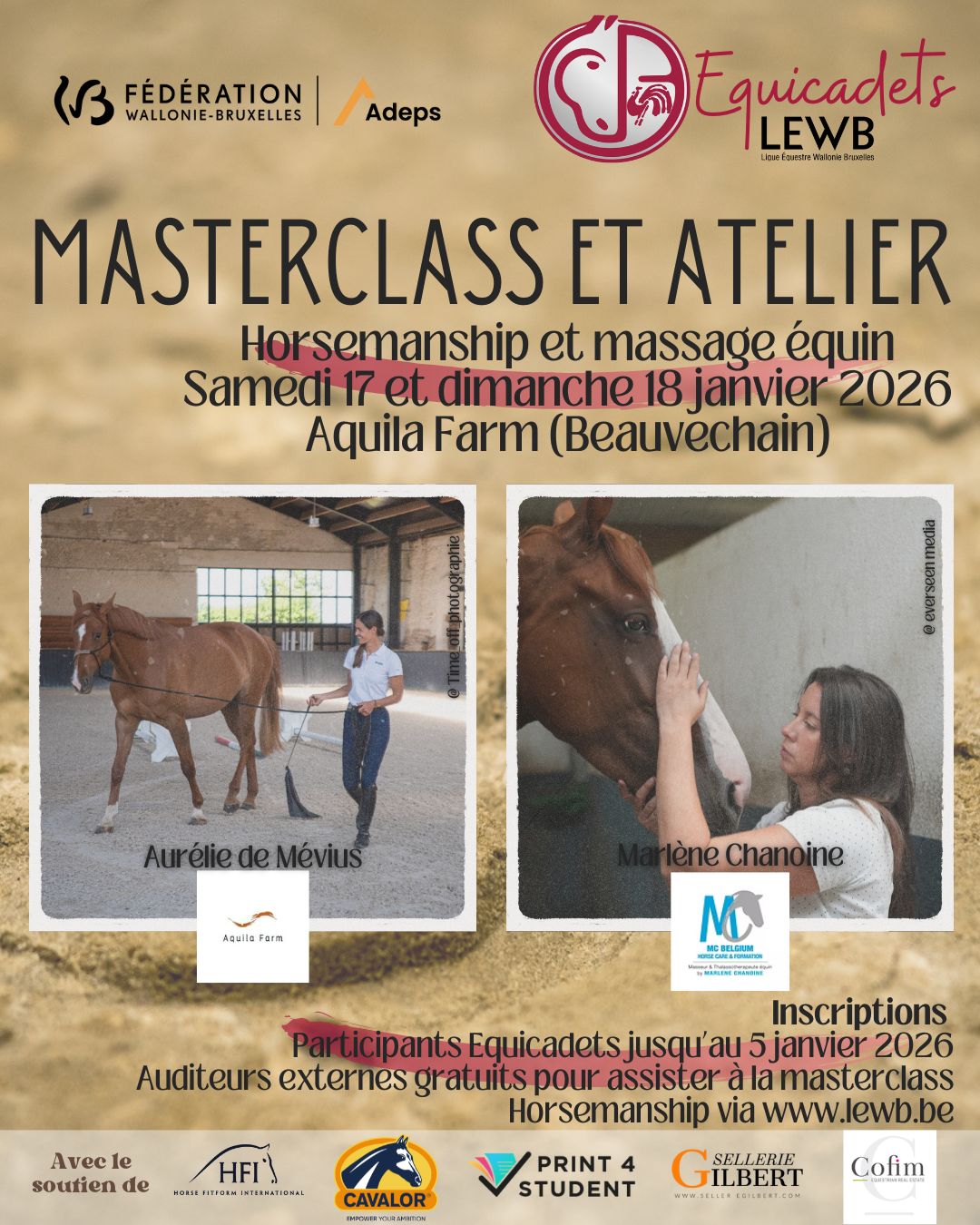 Masterclass Horsmanship: 6 séances individuelles pour Equicadets d’environ 1h par jour. Cette Masterclass est ouverte aux accompagnants et au grand public gratuitement en tant qu’auditeurs, sur inscription de préférence via ce formulaire en ligne jusqu’au jeudi 15 janvier 2026